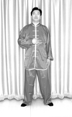 两脚分开,与肩同宽,脚尖朝前,平放地上,头正身直,百会朝天,挺胸收腹,沉肩垂肘,两膝微屈,膝盖与脚尖相齐,舌抵上腭,唇齿轻合,双目垂帘或轻闭(高血压留视线),两掌自然下垂,掌心向内,十指向下,掌指微微分开(见图①)。